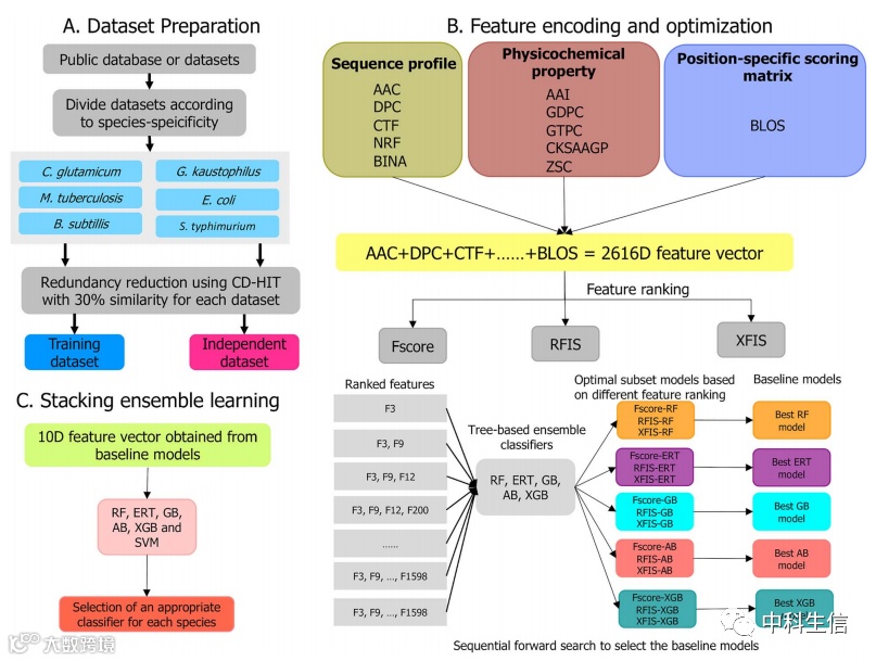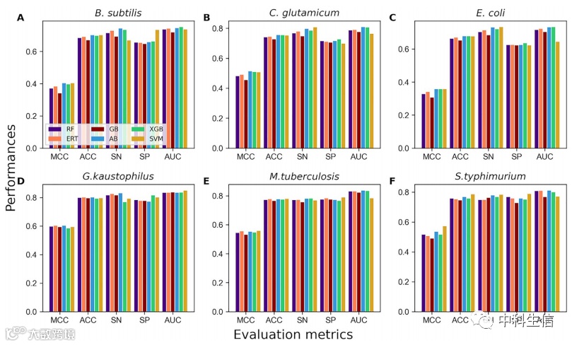 堆叠是一种综合技术:考虑不同的预测模型来生成稳定的叠加模型。该方法采用了一种有效的方案来降低各种预测模型的泛化错误率。将5个基线模型的预测值(Kace和class label的预测概率)进行组合,生成10D特征向量。与之前的方法不同,我们使用一个新的10D特征向量进行训练,使用10个随机的5倍交叉验证(图4)系统地评估了6个不同的分类器。结果表明,5个分类器(RF、ERT、AB、XGB和SVM)获得了相似的性能,略优于GB。在这5个分类器中,我们选择了枯草芽孢杆菌(B. subtilis)、谷氨酸芽孢杆菌(C. glutamicum)、考斯特氏菌(G. kaustophilus)3种AB分类器,结核病芽孢杆菌(M. tuberculosis)和鼠伤寒杆菌(S. typhimurium)2种SVM分类器,大肠杆菌(E. coli)XGB分类器,其分类性能略优于同类分类器。6种种模型通常被命名为STALLION,枯草芽孢杆菌的ACC、MCC和AUC分别为0.403、0.700和0.745;谷氨酰胺分别为0.513、0.756和0.809;大肠杆菌分别为0.357、0.678和0.733;kaustophilus的分别为0.603、0.801和0.836;结核分枝杆菌分别为0.557、0.779、0.782;鼠伤寒链球菌的检出率分别为0.571、0.785和0.770。