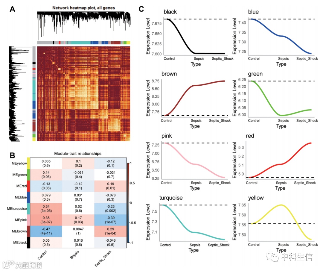 本研究的流程图如图1所示。我们计算了GSE13904(儿童)基因表达的方差,然后筛选出了最大方差前20%的4093个基因,以确定共表达模式。WGCNA识别出一个包含2550个基因的共表达网络(图2A)。这些基因聚集成8个共表达模块:棕色模块与败血症休克的正相关最强,而粉色模块与败血症休克的负相关最强(图2B)。通过计算不同临床样本中各模块的表达谱,我们确定了脓毒症发展过程中各模块的表达趋势(图2C)。棕色模块逐渐上调,而粉色模块逐渐下调,其顺序为:对照组<脓毒症患者<脓毒症休克患者。