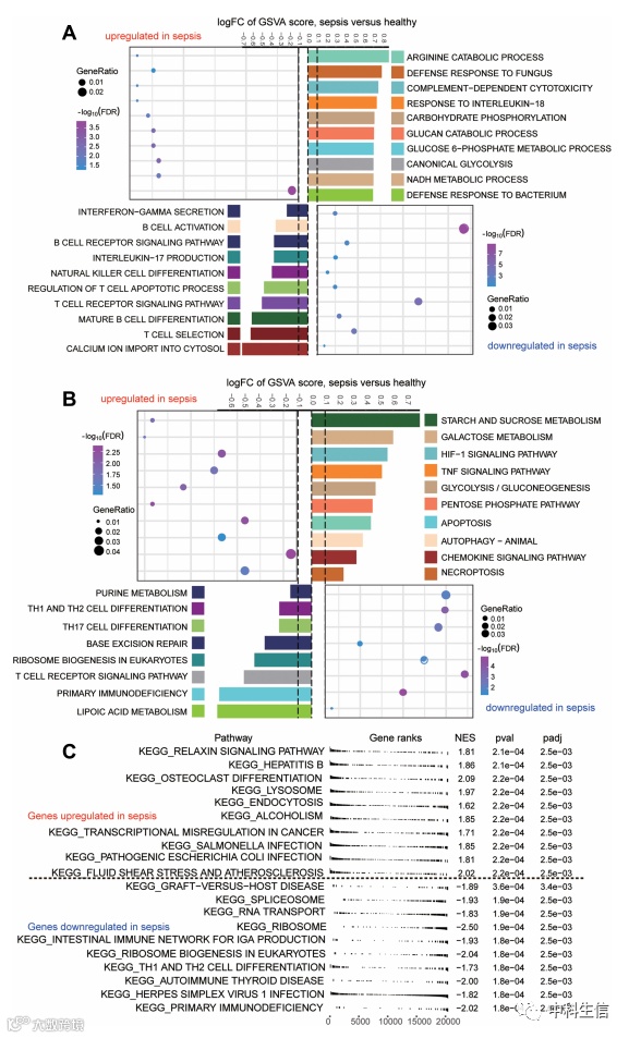 富集分析表明,基于上述常见基因,败血症患者对细菌的防御反应、补体依赖性细胞毒性和典型糖酵解均显著上调,而白细胞介素-17的产生、B细胞活化、T细胞受体信号通路显著下调(图4A)。KEGG结果显示,缺氧诱导因子1 (Hypoxia-Inducible Factor 1, HIF-1)信号通路、肿瘤坏死因子(Tumor Necrosis Factor, TNF)信号通路、糖酵解/糖异生在脓毒症中均显著上调,而Th1、Th2细胞分化、Th17细胞分化、T细胞受体信号通路显著下调(图4B)。在GSEA中,KEGG结果同样发现代谢相关通路上调,而免疫相关通路下调(图4C)。