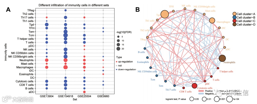 在富集结果中,我们发现脓毒症样本中大量免疫相关生物学功能显著下调。因此,我们评估了败血症患者的免疫细胞浸润情况(图5A)。不出所料,脓毒症与大多数类型的免疫细胞的浸润显著减少有关,除了巨噬细胞、肥大细胞和中性粒细胞的浸润增加。根据基因标记定义细胞毒性T细胞类型,CD8+ T细胞作为T细胞的一个亚型,与其他亚型不同的基因标记这些不同亚型的ssGSEA评分用于生成免疫细胞相互作用网络。我们将差异浸润的免疫细胞分成四组(图5B)。