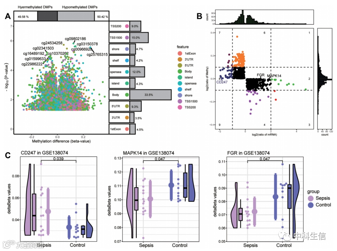 为了确定在疾病中甲基化可能被修改的败血症关键基因,我们首先分析了GSE138074(成人)败血症样本和对照组之间的差异甲基化位置(DMPs)(图8A)。与常见DEGs表达值方向相反的DMPs被过滤鉴定为甲基化标记。共鉴定出1313个甲基化标记(图8B)。其中包括MAPK14、FGR和CD247。MAPK14 (cg18213931)和FGR (cg16922167)的甲基化水平在脓毒症中低于对照组,CD247 (cg21161394)的甲基化水平在脓毒症中高于对照组(图8C)。