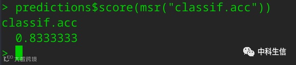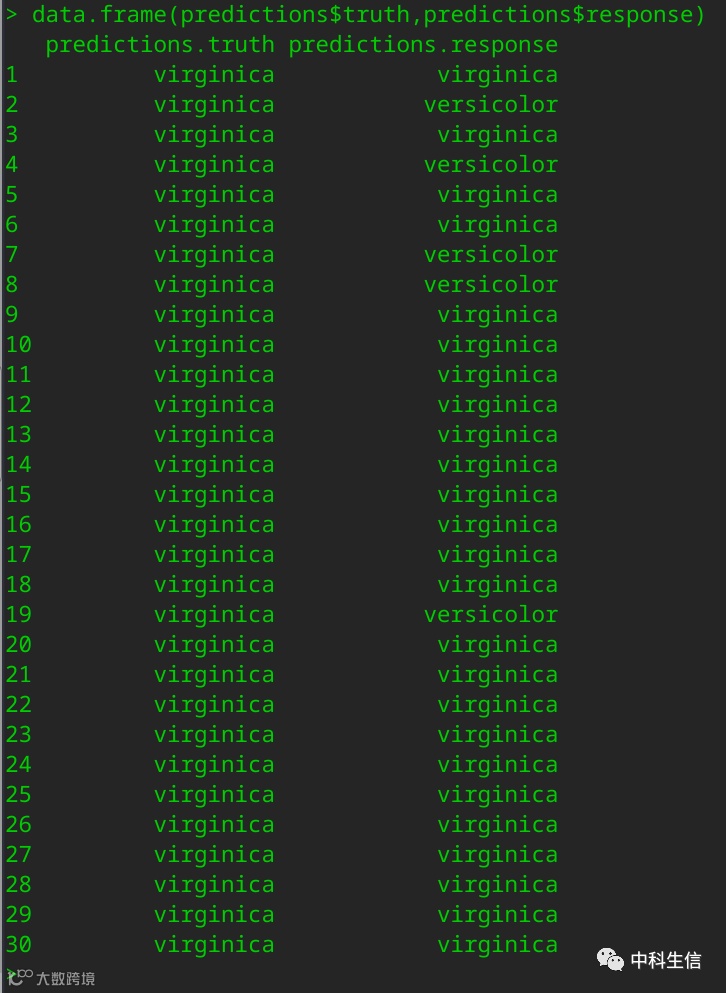 结果解读:预测准确性为83.33%,直接看预测的结果来算,在30个预测对象中,有25个被准确预测出来了,因此准确率就是25/30=0.8333