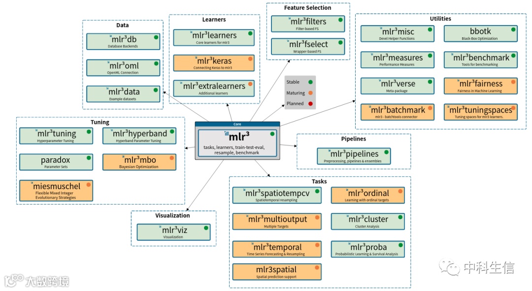今天介绍的"mlr3"只是一个基础包,它还有很多扩展包,如:mlr3benchmark, mlr3cluster, mlr3data, mlr3db, mlr3filters, mlr3fselect, mlr3hyperband, mlr3learners, mlr3measures, mlr3misc, mlr3oml, mlr3pipelines, mlr3prob, mlr3shiny, mlr3spatiotempcv, mlr3tuning, mlr3verse, mlr3viz。这些扩展的R包需要单独安装并加载。