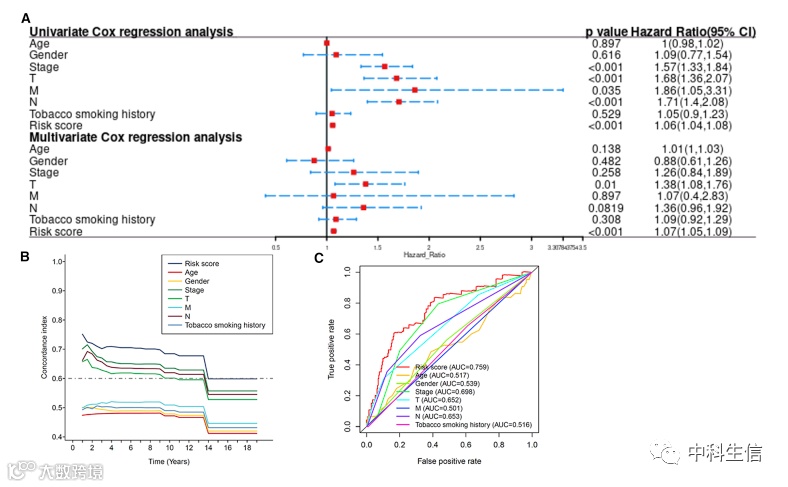 作者进行了单变量和多变量Cox 回归分析,以评估 12个m6A 相关 lncRNA的风险模型是否具有LUAD 的独立预后特征。随着时间的增加,风险评分的一致性指数始终大于其他临床因素的一致性指数,提示风险等级可以更好地预测LUAD的预后。风险等级的AUC也高于其他临床病理特征的AUC,说明12个m6A相关lncRNA对LUAD的预后风险模型比较可靠。
