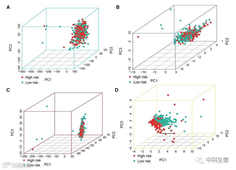 基于全基因表达谱、21个m6A基因、12个m6A相关lncRNAs以及12种基因表达谱分类的风险模型进行PCA分析,检验低风险组和高风险组的差异。结果表明,低风险和高风险群体具有不同的分布。