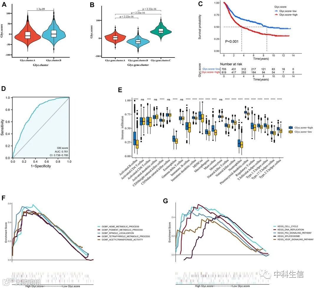 我们进一步用PCA方法构建了一个评分系统来量化GC患者的Glyc模式。这个评分系统被命名为Glyc.评分。首先,我们发现Glyc.cluster.B的Glyc.评分明显高于Glyc.cluster.A(图5A,p<0.001),Glyc.gene.cluster.C的Glyc.评分明显高于Glyc.gene.cluster.A和Glyc.gene.cluster.B(图5B,p<0.001)。Kaplan-Meier分析显示,Glyc.高分患者的预后明显差于Glyc.低分患者(图5C,p<0.001)。在GC队列中,Glyc.评分的预测价值为0.761,这表明Glyc.评分可以更好地预测GC的预后(图5D)。我们进一步分析了Glyc.评分和免疫细胞之间的关系。结果显示,高Glyc.评分组的免疫细胞在GC患者中表现出更高的表达水平(图5E)。功能富集分析显示,高Glyc.评分组在代谢和癌症相关的途径中富集,包括细胞周期、血红素代谢过程、色素代谢过程和四吡咯代谢过程(图5F,G)。