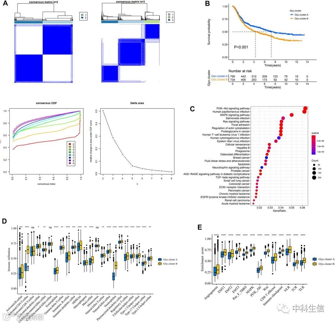为了对糖基化模式进行分类,我们在六个公认的标记基因的表达数据的基础上使用共识聚类。最终,我们确定了两个不同的群体,称为表型Glyc.cluster.A(n = 790),和Glyc.cluster.B(n = 734)(图3A)。Kaplan-Meier分析显示,Glyc.cluster.B的预后比Glyc.cluster.A的预后差(图3B,p < 0.001)。然后,我们进行KEGG比较Glyc.cluster.A和Glyc.cluster.B之间的通路富集情况。如图3C所示,与Glyc.cluster.A相比,Glyc.cluster.B在一些免疫和癌症相关的途径中明显富集。接下来,我们探讨了这两个集群与GC中的免疫浸润水平是否存在相关性。因此,我们使用ssGSEA方法来评估两个簇之间的免疫细胞的组成。如图3D所示,我们发现Glyc.cluster.B组的免疫细胞在GC患者中表现出更高的表达水平。随后的分析显示,Glyc.cluster.B组的基质活性明显增强,如上皮-间质转化和血管生成途径的激活,这证实了我们的猜测(图3E)。接下来,我们使用CIBERSORT和xCell算法的方法来计算两个集群之间的免疫细胞的组成。如补充图1A,B所示,我们发现Glyc.cluster.B组的免疫细胞在GC患者中表现出更高的表达水平。