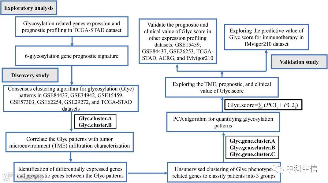 分享一篇2022年2月15日发表在frontiers in Cell and Developmental Biology(影响因子6.684)《Expression Patterns of Glycosylation Regulators Define Tumor Microenvironment and Immunotherapy in Gastric Cancer》。糖基化(Glyc)普遍与胃癌(GC)的病理生理学有关。然而,关于糖基化调节器和肿瘤微环境(TME)以及GC的免疫治疗之间的关系的研究仍然很少。我们从8个队列中提取了1,956名GC患者的表达数据,并使用无监督聚类方法将6个标记基因的糖基化模式系统地表征为表型聚类。接下来,我们构建了一个Glyc评分来量化每个GC患者的糖基化指数。最后,我们分析了Glyc评分与临床特征之间的关系,包括分子亚型、TME和GC的免疫疗法。根据预后的糖基化相关差异表达基因,我们构建了Glyc评分,并将样本分为高和低Glyc评分组。