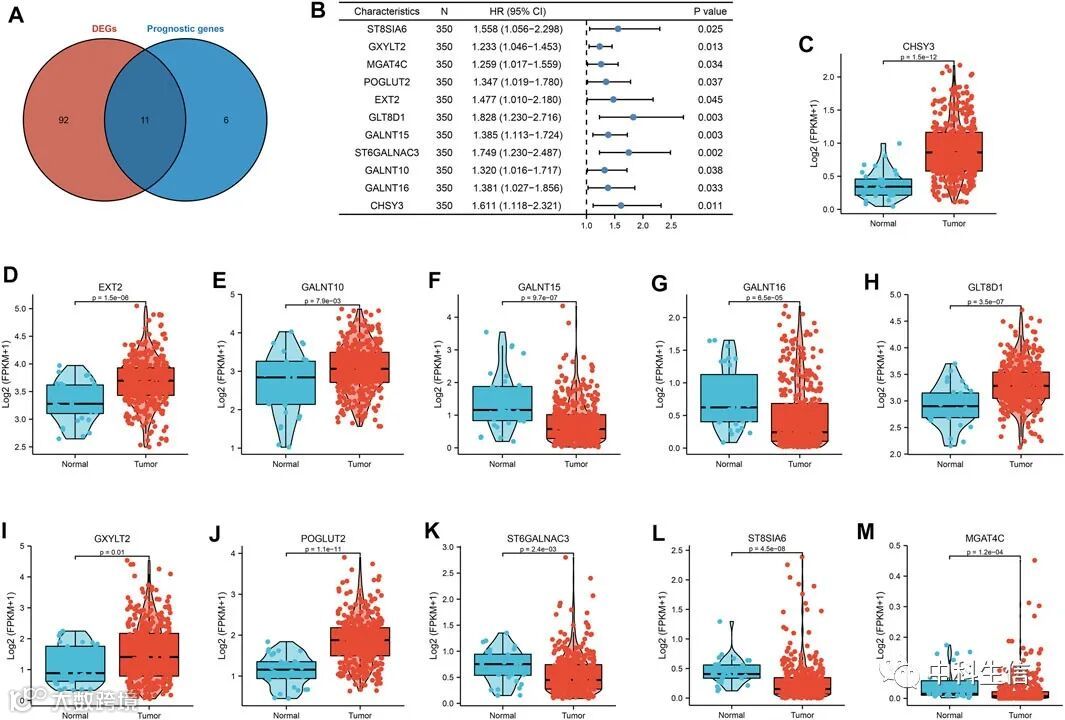 Kaplan-Meier对数分析显示,17个糖基化调节因子与GC患者的OS明显相关。最后,共保留了11个预后性的Glyc相关DEGs(图2A)。其中,在TCGA-STAD数据集中,11个糖基化调节因子的高表达与不良OS显著相关(图2B)。此外,研究结果表明,6个糖基化调节因子(GALNT10、EXT2、GLT8D1、GXYLT2、POGLUT2和CHSY3)在GC中的表达量高于正常组织。然而,五个糖基化调节器(ST8SIA6、MGAT4C、GALNT15、ST6GALNAC3和GALNT16)在GC中的表达比正常组织低(图2C-M)。最终,六个糖基化调节器被纳入以下分析中。