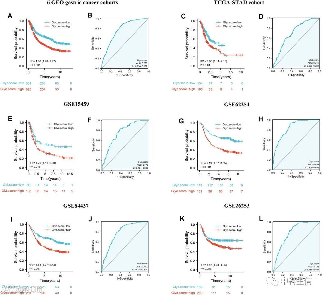 图7. Glyc.评分模型的外部验证。(A)六个GEO数据集(GSE84437, GSE34942, GSE15459, GSE57303, GSE62254, 和GSE29272)中高和低Glyc.评分患者组的Kaplan-Meier曲线。(B) 六个GEO数据集中Glyc.评分的预测价值。(C) TCGA-STAD中高和低Glyc.评分患者组的Kaplan-Meier曲线。(D) TCGA-STAD中Glyc.评分的预测价值。(E) GSE15459中高和低Glyc.评分患者组的Kaplan-Meier曲线。(F) GSE15459中Glyc.评分的预测价值。(G) GSE62254中高和低Glyc.评分患者组的Kaplan-Meier曲线。(H)GSE62254中Glyc.评分的预测价值。(I) GSE84437中高和低Glyc.评分患者组的Kaplan-Meier曲线。(J) GSE84437中Glyc.评分的预测价值。(K) GSE26253队列中Glyc.评分的无复发生存分析。(L) GSE26253中Glyc.评分的预测价值。