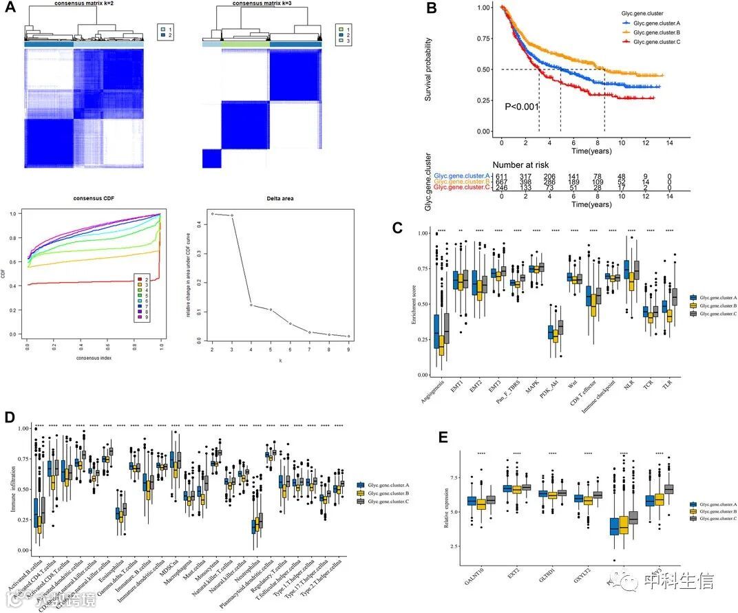 图4. (A) 基于预后的Glyc相关差异表达基因的无监督共识聚类,将患者分为三组,称为Glyc.基因簇A、Glyc.基因簇B和Glyc.基因簇C。 (B) Kaplan-Meier曲线显示三个Glyc.基因簇之间存在明显差异。(C) 三个Glyc.基因簇之间的基质激活途径包括EMT、TGF beta和血管生成途径的差异。(D) 三个Glyc.基因簇中每个TME浸润细胞的丰富程度。盒子的上端和下端代表数值的四分位数范围。框中的线代表中位数,黑点表示离群值。(E) 三个Glyc.基因簇中六个Glyc调节器的表达。盒子的上端和下端代表数值的四分位数范围。框中的线代表中位数,黑点表示离群值。星号代表统计学上的P值(*p < 0.05;**p < 0.01;***p < 0.001;****p < 0.0001)。