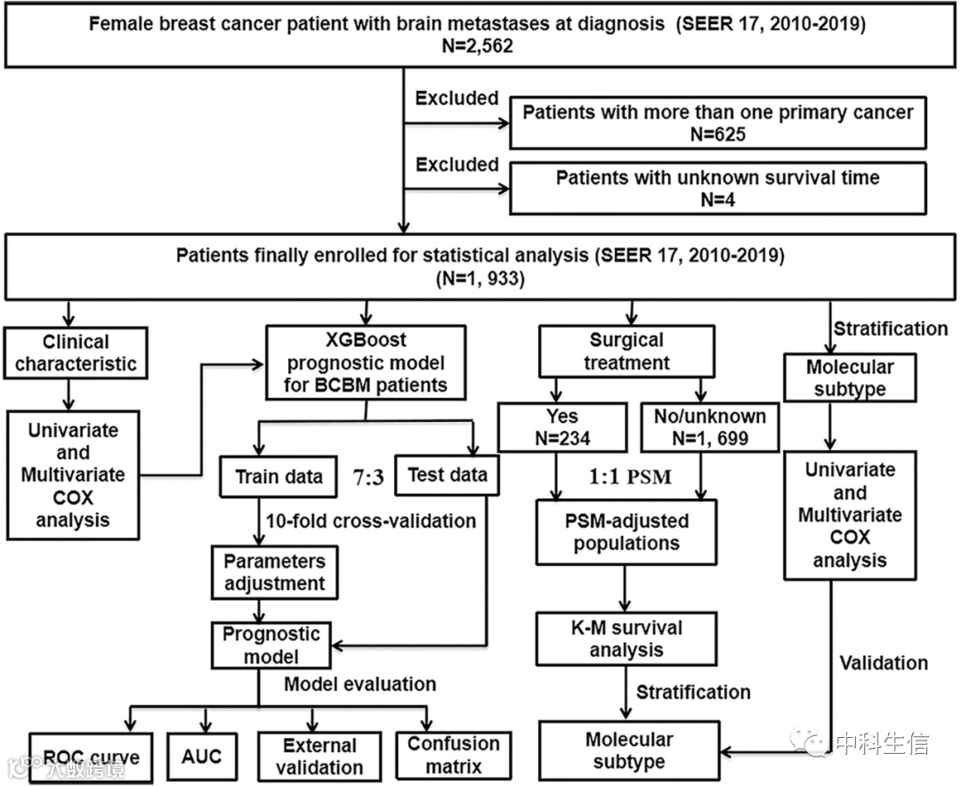 本研究基于来自SEER数据库(2010-2019)的BCBM数据,通过COX回归分析以确定BCBM患者的预后因素。通过交叉验证,构建了XGBoost模型来预测BCBM患者的生存期。同时,通过临床收集BCBM样本来验证模型。利用倾向性评分匹配和K-M生存分析,调查了接受手术治疗或不接受手术治疗的患者的预后情况,通过对不同分子亚型患者的COX亚组分析进行了进一步验证。