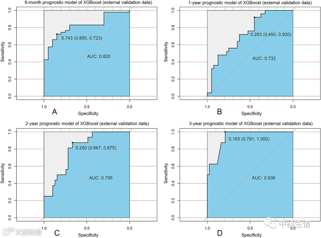 为了进一步验证我们的模型,收集了67名BCBM患者的临床和预后信息。结果显示,XGBoost模型在外部独立的数据集中仍表现出良好的稳健性[6个月:AUC=0.820;1年:AUC=0.732;2年:AUC=0.795;3年:AUC=0.936]。