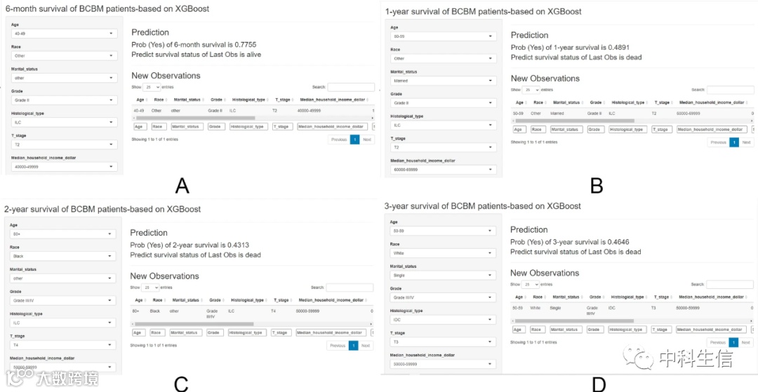 为了帮助研究人员和临床医生学习使用我们的预后模型,我们在shiny平台上开发了用户友好的网络应用。Te网络界面允许用户输入新样本的临床特征,然后网络应用可以根据BCBM患者的信息帮助预测生存概率和生存状态。