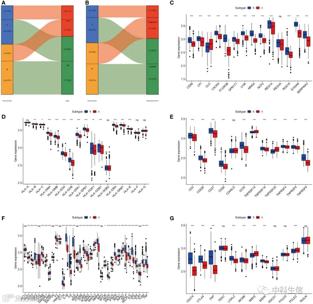 年龄和疾病范围是结肠炎相关结直肠癌的危险因素,年龄较小且病变范围较广的 UC患者更有可能转化为CAC。我们观察到两种亚型之间的年龄分布和疾病程度不同。如图4A所示 ,A组中30岁以上的患者比例更高 (64.30%),而 B 组中超过一半的30岁以下患者 (55.30%)。就病变范围而言,B组中病变广泛的患者较多(62.50%),而A组中66.67%的患者表现为局限性病变(图4B)。之后,我们筛选了UC 和 CAC 之间DEGs(GSE37283数据集)。我们接下来比较了不同中性粒细胞亚型之间CAC相关基因表达的差异。我们发现大多数 CAC相关基因在簇B中高表达,因此我们得出结论,具有高度浸润的中性粒细胞的簇 B更有可能从UC转化为 CAC(图 4C)。主要组织相容性复合体和T细胞刺激因子表达水平在簇B中较高,但在TNFRSF14和TNFRSF25中则不然(图 4D、E)。最近的研究表明,UC中高度浸润的嗜中性粒细胞可形成嗜中性粒细胞胞外陷阱,有助于结肠炎向癌症的转化。从综述中,我们主要收集了有关促进NET形成的配体和受体、下游信号和被确定为NET粘附框架的分子的信息。根据我们的结果(图 4F), 几乎与中性粒细胞胞外陷阱相关的基因在B亚型中高表达,表明B簇中可能存在更多的中性粒细胞胞外陷阱。此外,我们比较了两种亚型之间免疫检查点的差异表达,我们发现大多数免疫检查点,包括PD-L1和CTLA4,在亚型B中高表达(图 4G)。