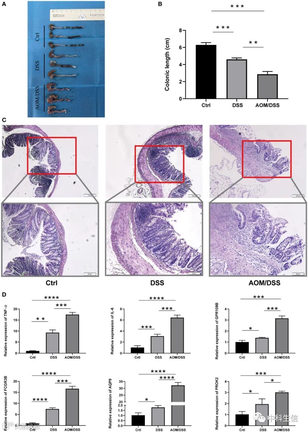 DSS诱导的结肠炎和AOM/DSS诱导的CAC用于进一步验证生物标志物基因的表达。不同模型小鼠的结肠长度与对照小鼠有显著差异( 图 6A、B )。组织学分析表明小肠结肠炎小鼠的肠上皮细胞存在损伤,AOM/DSS 组小鼠有明显的发育不良( 图 6C )。我们还使用RT-qPCR检查了 IL-6、TNF-α 和生物标志物基因的表达水平。与 Ctrl 组相比,DSS 组的基因表达增加,并且在 AOM/DSS 组小鼠中甚至更显著上调( 图 6D )。