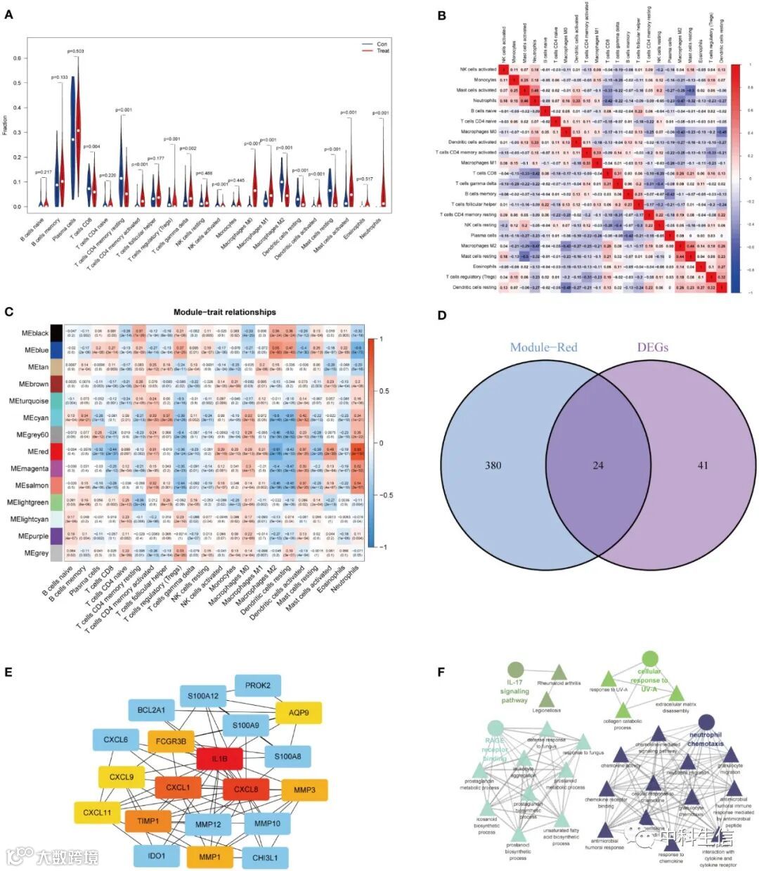 基于 CIBERSORT 估计,我们确定了UC和健康对照样本中免疫细胞类型的相对浸润丰度。大多数UC浸润的免疫细胞比对照组更丰富(图2A)。在UC样本中,中性粒细胞、肥大细胞、活化的CD4 T细胞、T细胞γδ、M0巨噬细胞和M1巨噬细胞是主要的浸润免疫细胞。图2B显示了免疫细胞之间的相关性。接下来,我们使用 WGCNA 包构建共表达网络并计算平均连接和Pearson相关值以对样本进行聚类。节点连通性的对数K(K)与节点概率的对数(P(K))呈负相关,相关系数在0.85以上。结果,确定了 14 个主要模块(图 2C)。为了选择重要的模块来研究模块与免疫细胞之间的关系,我们根据模块之间的皮尔逊相关系数和样本特征发现红色模块与中性粒细胞的相关性最强(R = 0.83,P = 3e-193)。结合DEGs的富集结果,进一步探讨了UC中中性粒细胞的浸润特征。因此,通过关注红色模块并将红色模块中的基因与DEGs 相交,获得了 24 个中性粒细胞相关差异表达基因(NADEGs)(图 2D). 然后使用Cytoscape中的CytoHubba插件识别NADEG中的核心基因。使用Degree算法,我们将前5个中枢基因确定为 IL1B、CXCL8、CXCL1、TIMP1 和 FCGR3B( 图 2E )。ClueGO 随后分析了NADEG的途径和过程富集。RAGE 受体结合、细胞对UV-A的反应、IL-17信号通路和中性粒细胞趋化性高度富集(图 2F).