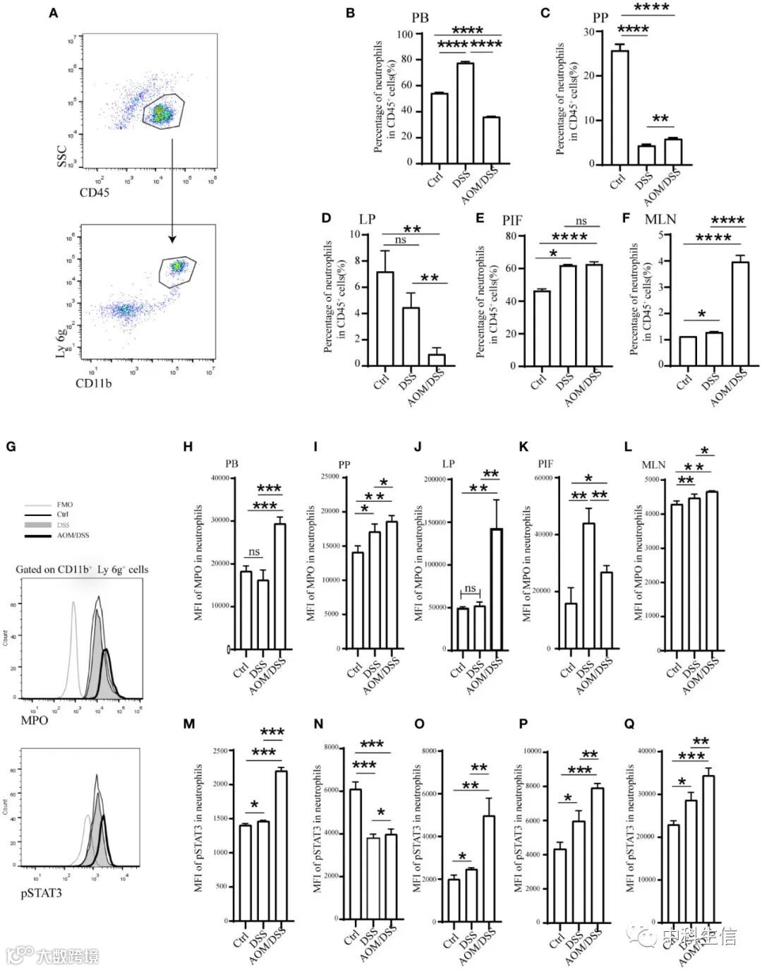 然后,我们用不同的小鼠模型(Control, DSS和AOM/DSS)进一步研究中性粒细胞浸润的变化。结肠炎的开始导致PB、MLN和PIF中大量募集CD11b+ Ly 6g+中性粒细胞(图7A、B、E、F)。AOM/DSS小鼠PP中的中性粒细胞比例高于DSS小鼠(图7C),但LP中的中性粒细胞比例下降(图7D)。此外,DSS小鼠的PB、PP、LP、MLN和PIF中MPO水平升高(图7G-L), AOM/DSS小鼠的MPO水平甚至更高(图7H-J, L)。JAK-STAT信号通路已被证实在炎症和肿瘤的发生发展中发挥潜在作用。AOM/DSS小鼠的PB、LP、MLN和PIF中pSTAT3水平的升高(图7M,O-Q),这与GSVA的结果一致(图3E)。这些结果表明,在DSS和AOM/DSS小鼠模型中,中性粒细胞百分比和MPO、pSTAT3表达增加。这些结果还表明,中性粒细胞和JAK-STAT通路可能参与了结肠炎向结肠炎相关结直肠癌的转化。
