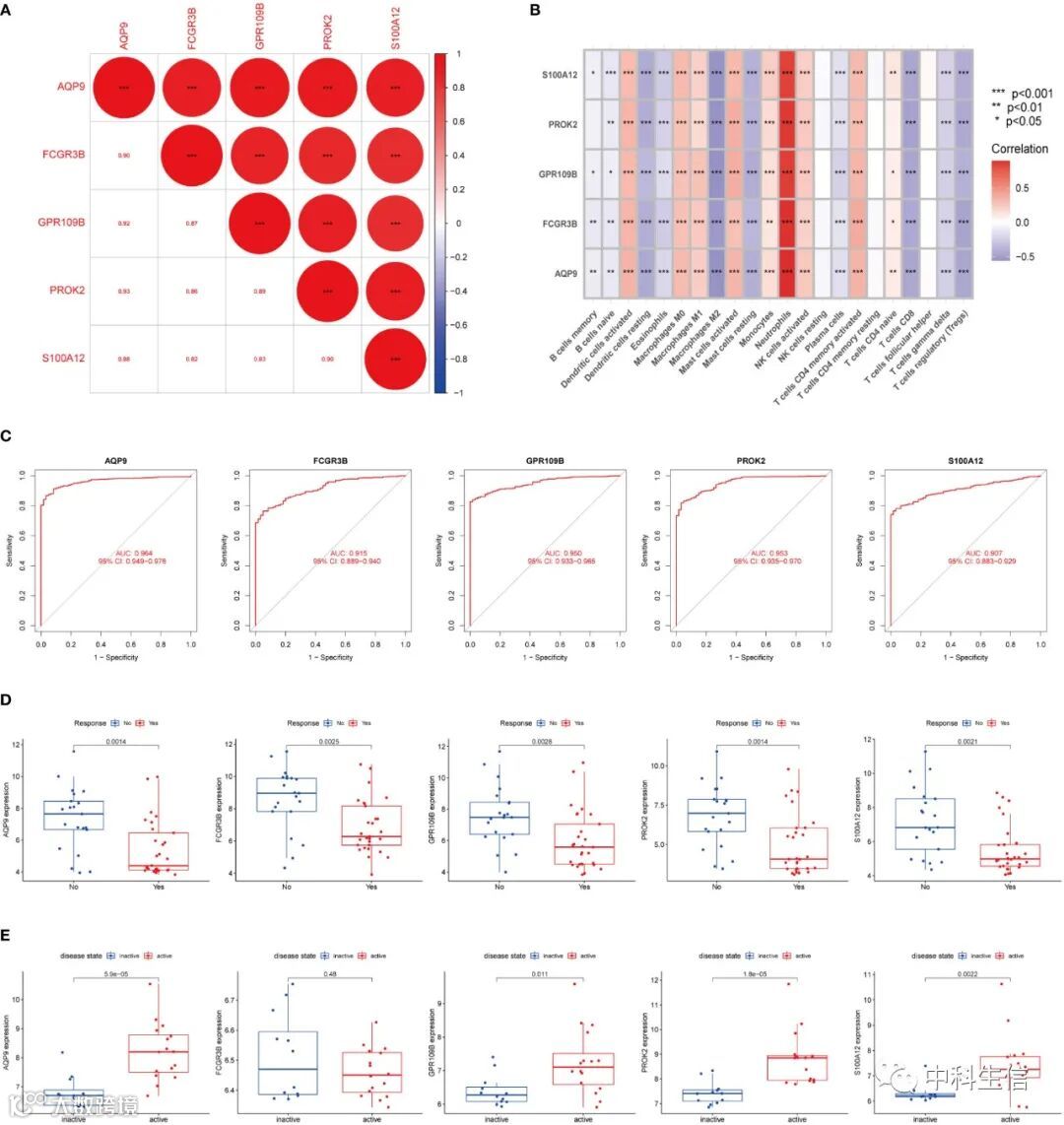 为了更好地找到可以诊断UC甚至CAC的基因,我们使用LIMMA包在中性粒细胞相关亚型之间鉴定了5个DEGs(AQP9、FCGR3B、GPR109B、PROK2、S100A12)。首先,我们检查了这5个基因之间的相关性,如图5A所示,高度相关。接下来,我们计算了这些基因与免疫细胞之间的相关性。这些基因还与中性粒细胞以外的其他免疫细胞相关(图5B)。为了解释每个基因区分UC和正常样本的能力,计算了ROC曲线下的面积(AUC)以评估这些基因的诊断价值(图5C)。接下来,我们比较了接受抗TNF-α治疗的GSE92415和GSE16879队列中5个基因的表达,以确定是否可以评估抗TNF-α 治疗的效果。如图5D所示,所有5个基因的表达水平在响应组中均降低,表明这些基因也可用作评估抗TNF-α治疗反应的标志物。此外,我们研究了这五个基因是否可用于区分GSE53306队列中活动性UC患者和缓解型UC患者。除 FCGR3B外,其余基因的表达在活动性UC中更高,如图5E所示。