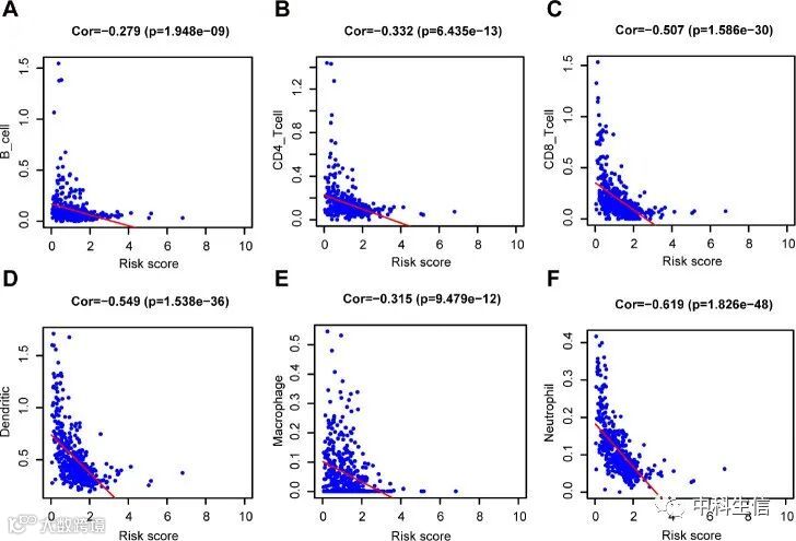 此外,风险评分与B细胞、CD4+ T细胞 、CD8+ T细胞、树突状细胞、巨噬细胞和中性粒细胞相关(图8)。