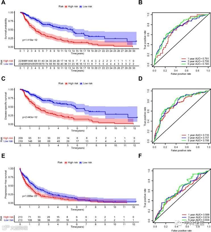 根据中位风险评分作为临界值,将来自TCGA的黑色素瘤患者分为低风险组 (n=224) 和高风险组 (n=223)。Kaplan-Meier分析显示,与低风险组相比,高风险组的OS较差(图5A)。此外,时间依赖性ROC分析显示,1、3、5年AUC分别为 0.701、0.726和0.745,表明我们的预后特征具有很强的预测能力(图5B)。对于DSS和PFS,观察到类似的结果。与低风险组相比,高风险组的DSS(图5C)和PFS(图5E)更差。使用7基因预后特征的1年、3年和5年DSS的AUC分别为 0.733、0.757和0.766(图5D)。预测1年、3年和5年PFS的AUC分别为0.588、0.619和0.634(图5F)。这些结果表明,7基因预后特征是OS、DSS和PFS的有效预后指标。