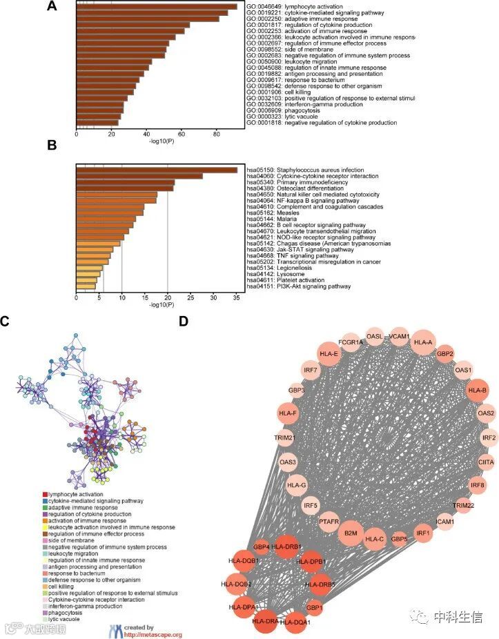 通过比较TCGA数据集中的高免疫细胞浸润组与低免疫细胞浸润组,共鉴定出659个DEG,包括607个上调基因和52个下调基因。使用Metascape进行功能分析。最重要的GO术语和KEGG包括淋巴细胞激活和细胞因子-细胞因子受体相互作用(图2A-B)。GO和KEGG丰富术语的网络如图2C所示。此外,使用STRING数据库分析了659个DEG,并构建蛋白质-蛋白质相互作用 (PPI) 网络。MCODE软件建立了几个中心模块(图2D,模块1)。