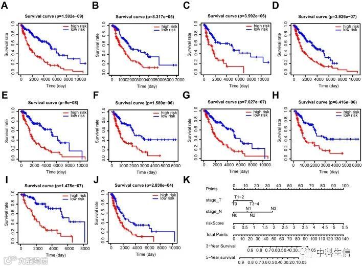 此外,我们对OS进行了分层分析,以确定我们的预后特征在黑色素瘤亚组中的预后能力。与各层的低风险患者相比,高风险患者的预后更差(图6A-6J)。最终,我们结合了预后因素来制定OS列线图(图6K)。