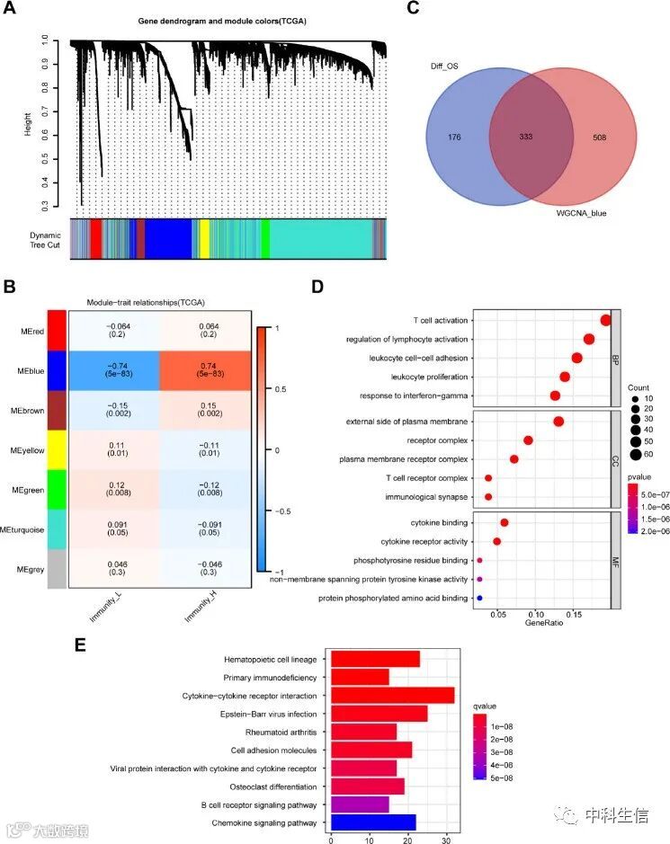 加权基因共表达网络分析(WGCNA)检测到7个共表达模块(图3A),并分析了它们与免疫相关组的关联。蓝色模块是免疫细胞浸润组中最相关的模块(|r|=0.74,P=5e-83)(图3B),提取所选模块中的841个基因进行进一步研究。共获得333个相交的DEG(图3C)。