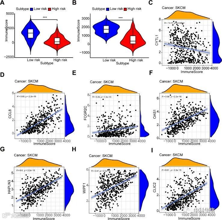 与低风险组相比,高风险组的免疫评分更低(图7A)。独立数据集GSE54467中的结果也证实了类似的相关性(图7B)。此外,CCL8、FCGR2C、OAS1、HAPLN3、WIPF1、CLIC2的表达与免疫评分(图7D-I)显着正相关。但是CYTL1在免疫评分中具有相反的结果(图7C)。