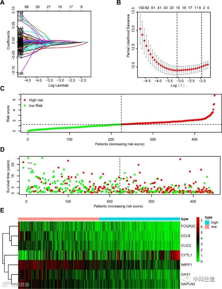 对333个DEG进行单因素Cox回归分析,选择294个DEG进行进一步研究。使用Lasso分析,筛选出16个基因以进行多因素Cox回归分析(图 4A-B)。最后,使用7个关键基因(CYTL1、CCL8、FCGR2C、OAS1、HAPLN3、WIPF1、CLIC2)构建预后特征:风险评分 = 0.007* CYTL1 - 0.033* CCL8 - 0.021* FCGR2C - 0.015* OAS1 - 0.037* HAPLN3 - 0.014* WIPF1 - 0.023* CLIC2。两组之间风险评分、生存状态和基因表达谱的分布如图4C-E所示。