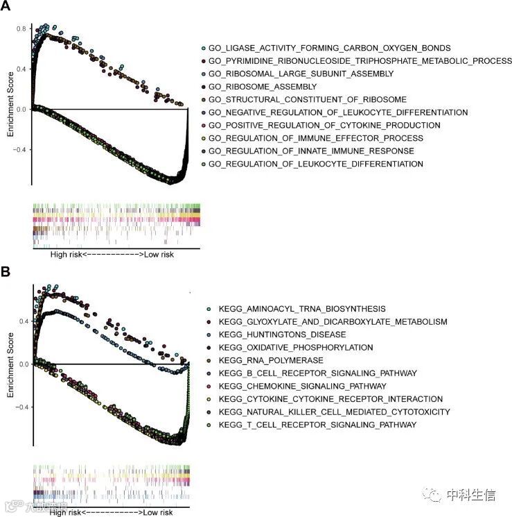 GSEA分析用于7基因预后特征的功能注释。我们发现,10多个与免疫相关的GO术语和KEGG通路在低风险组中明显富集,而在高风险组中很少富集。前5个与免疫相关的GO术语如图9A所示,例如细胞因子产生的正调节。前5个免疫相关途径显示在图9B中,例如自然杀伤细胞介导的细胞毒性。