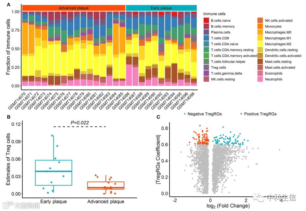 在晚期和早期动脉粥样硬化斑块中鉴定 DETregRG如图1。(A) CIBERSORT 算法估计的 27 个样本中 22 个免疫细胞的丰度。(B) 13个早期斑块样本和 16 个晚期斑块样本之间的 Treg 分数。(C) 13个早期斑块样本和 16个晚期斑块样本之间差异表达基因的火山图。