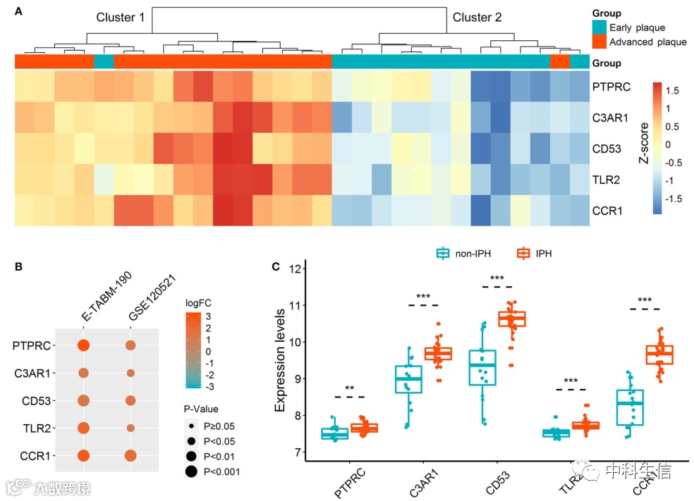 晚期和早期动脉粥样硬化斑块之间hub DETregRGs 的表达模式(图3)。(A) GSE28829数据集中五个hub DETregRG 的无监督层次聚类热图。(B)验证稳定和不稳定动脉粥样硬化斑块之间的hub DETregRG。(C)验证有和没有 IPH 的动脉粥样硬化之间的hub DETregRG。