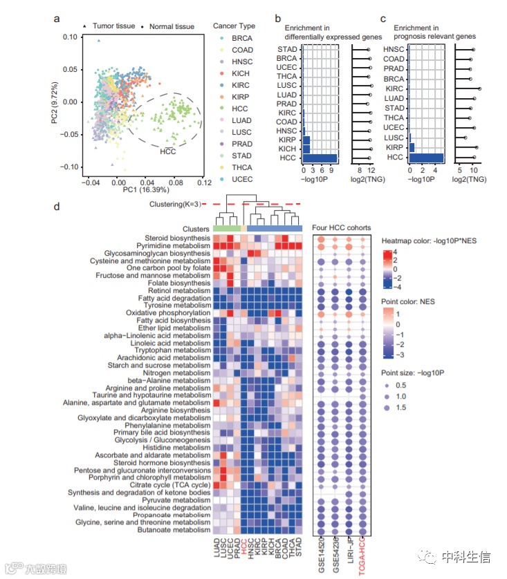 对 TCGA-HCC 和 TCGA 中其他 12 种癌症类型的核心 MIPro(即 MPI 网络中具有四个以上邻居的 MIPro)的 mRNA 表达进行了主成分分析(PCA)。基于 PCA 的前两个主要成分 (PC),HCC 显示出最独特的代谢模式。通过基因集富集分析(GSEA)估计了每种癌症类型中肿瘤和正常组织之间的通路水平变化,与正常组织相比,HCC 肿瘤组织中的大部分代谢途径被下调,并通过两个GEO数据集进行了验证。