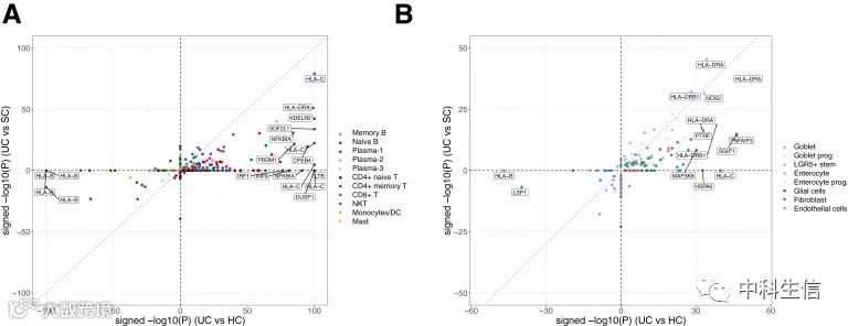 在GWAS目录(https://www.ebi.ac.uk/gwas/)中公布的511个UC风险基因中,有141个在UC和对照组受试者之间的195个二基因组中被发现,其中90%在UC中显示上调。与我们的DEGs重叠的身高相关位点的数量相比,UC风险位点在上皮细胞(吞噬细胞、吞噬细胞祖细胞、LGR5+干细胞和肠细胞)、内皮细胞、胶质细胞、成纤维细胞和各种免疫细胞(Plasma-1、幼稚和记忆B细胞、CD4+T细胞和自然杀伤T细胞)中显示富集。在这些UC风险DEGs中,有8个基因以前在亚洲人群的UC GWASs中被报道过。CFB、HLA-DQA1、HLA-DQB1、HLA-DRA、HLA-DRB1、IRF8、PTPRC、和SLC26A3。特别是,与SC和HCs相比,HLA-C、HLA-DRA和HLA-DRB1在UC的上皮细胞中被上调(图8A和B及图9),表明炎症组织中的抗原呈递活动增加,这与以前报道的DEGs的富集途径一致。