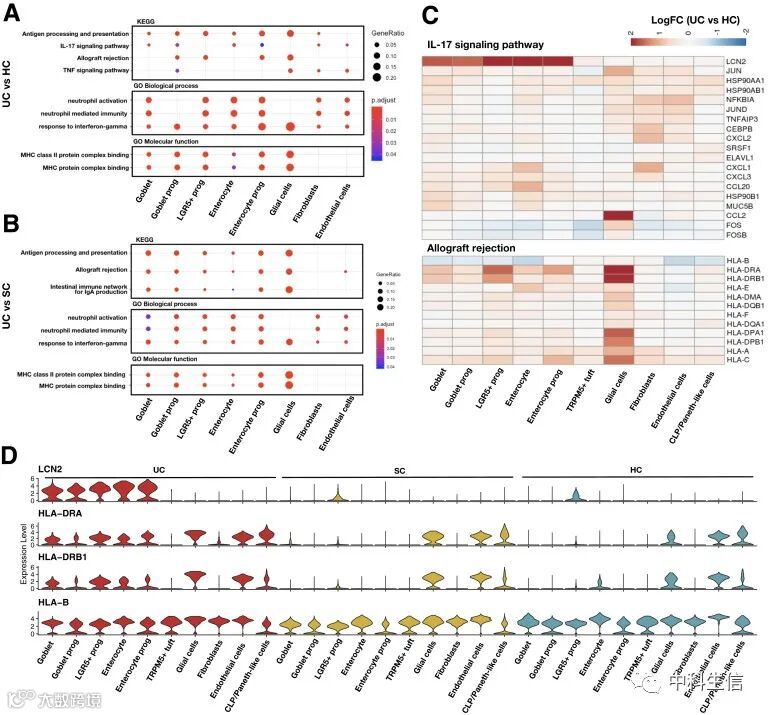 在上皮和基质系中,炎症组织和HCs之间上调的基因在抗原处理和呈递途径和MHC II类复合物活动中富集。与SC相比,这些途径在UC中也有显示(图4A和B)。UC和HCs的LGR5+干细胞、肠细胞祖细胞和消化道祖细胞的差异表达基因(DEGs)过度代表了排斥性免疫的功能,但成熟细胞(肠细胞和消化道)失去了排斥反应的功能差异。值得注意的是,参与MHC二类分子的大部分基因,如HLA-DRA、HLA-DRB1和HLA-DRC,在UC中被上调,但MHC一类分子HLA-B却被下调。