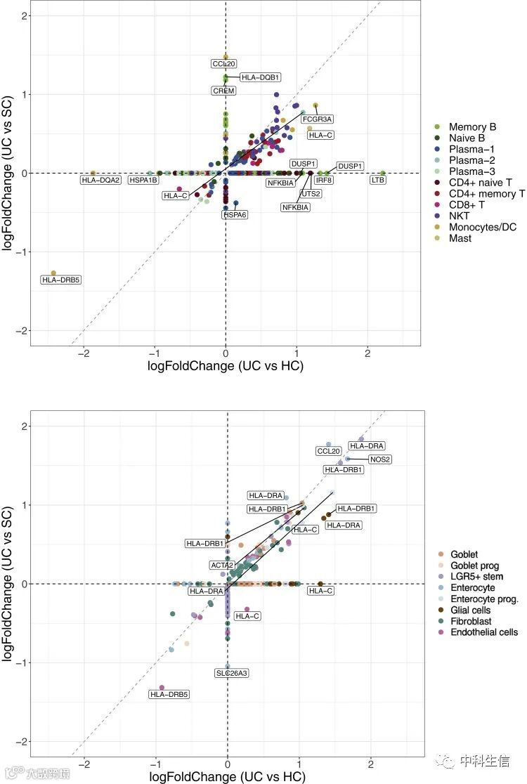 研究者的分析显示,与HC或SC相比,UC的上皮细胞和基质细胞中有许多MHC分子上调。UC与SC比较,记忆B细胞和T细胞的IRF8升高,而与SC比较,UC组IRF8升高。因此,研究者对免疫细胞、上皮细胞和基质细胞中差异表达的UC风险基因的意义进行了系统比较。它揭示了相反的模式:在上皮细胞和基质细胞中比在免疫细胞中,UC和HCs之间确定的差异表达风险基因更可能在UC和SC之间差异表达(图8A和B和图9)。