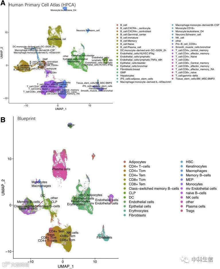 UMAP显示了HPCA (Human Primary Cell Atlas)和(B)Encode Blueprint的细胞类型