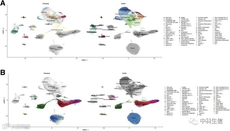UMAP显示了本研究和Smillie等人的相同,由(A)上皮细胞和基质细胞和(B)免疫细胞分开。