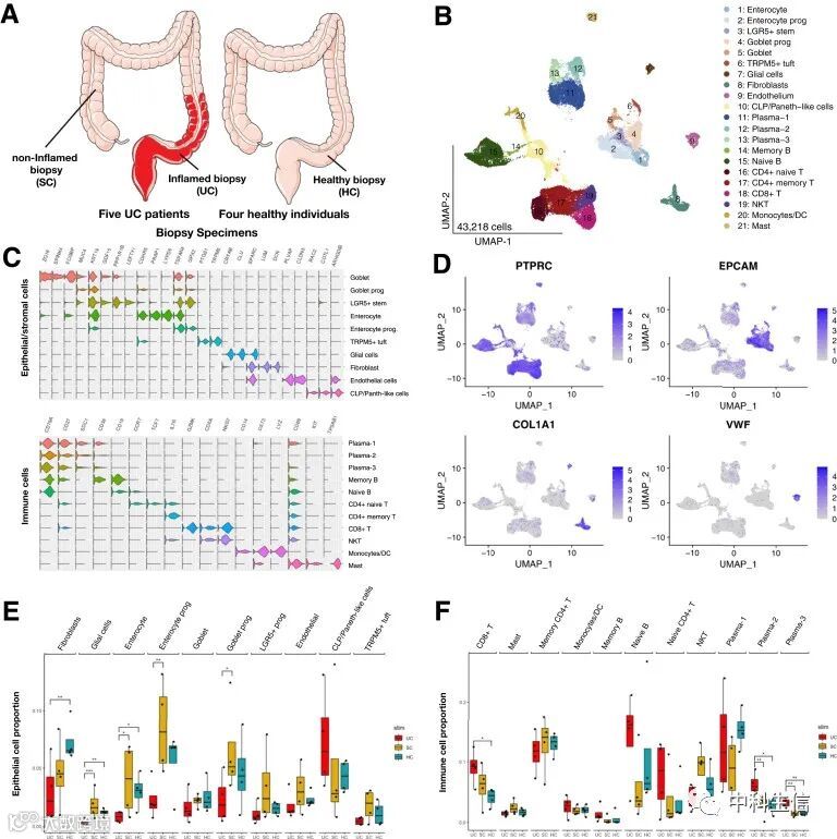 研究方法:我们对12例中国汉族UC患者和健康对照组的结肠活检进行了单细胞RNA测序(scRNA-seq)分析。