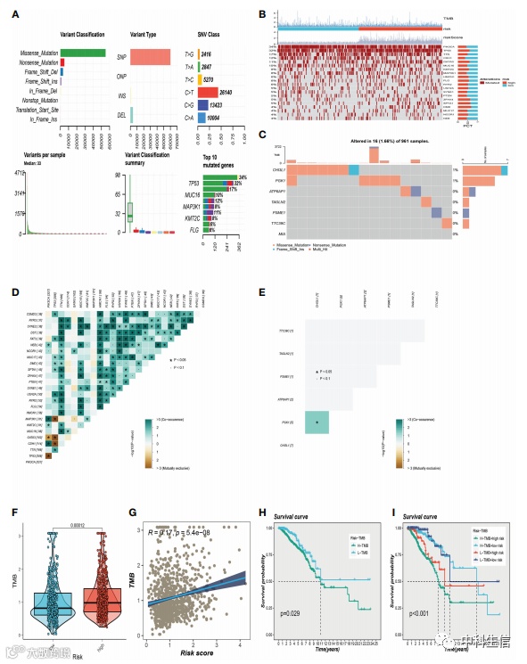 对BC 样本的突变类型进行分析,其中最常见的突变类型是错义突变。前 3 个最常见的突变基因是 TP53、MUC16 和 MAP3K1。还检查了高风险和低风险组中的代表性基因变异,TP53、GATA3、ZFHX4、SPTA1、DMD等基因突变频率在高风险人群中位居前五位。低风险组突变频率最高的前5个基因分别为PIK3CA、CDH1、MAP3K1、PTEN、NEB。评估两个风险组的肿瘤突变负荷(TMB)评分差异,两个风险组之间的TMB水平差异显著,风险等级与TMB值之间存在正相关关系,进一步分析了TMB对预后的影响。生存分析表明,较高的 TMB 水平与较差的 OS 相关。