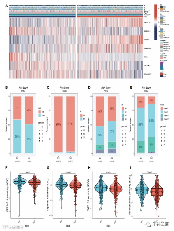 结合临床特征,构建两个风险组样本的临床热图以确定两个风险组之间临床特征的差异。