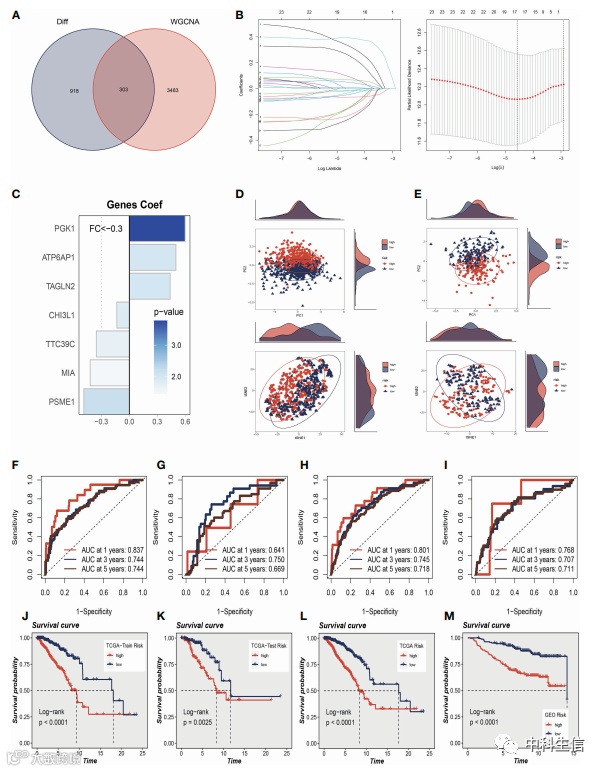 为了进一步探讨 SRGs与 BC 患者的预后的关系,通过与单细胞数据交叉获得了与鞘脂代谢活性的最相关基因。使用 TCGA-BC 中的训练集进行模型构建,单因素分析共获得 63 个预后基因(P <0.01)。接下来,采用 LASSO Cox 回归分析来开发风险模型,最终筛选出7个模型基因(TAGLN2、CHI3L1、PGK1、ATP6AP1、MIA、PSME1、TTC39C)。