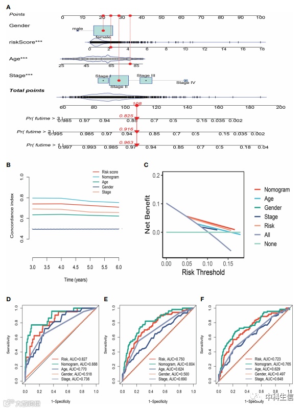 使用临床信息和风险评分,创建列线图以更准确地量化 BC 患者的风险。列线图可以帮助更准确地确定患者风险并指导未来的治疗决策。我们还进行了决策曲线和一致性指数研究,确定每个临床特征的面积和横轴,以评估临床决策价值。结果表明,该列线图的疗效优于其他临床指标,表明它可有效预测患者的预后,可作为临床决策工具,进行预后 ROC 分析以彻底评估该列线图的准确性。根据研究结果,1年、3年和5年的曲线下面积(AUC)分别为0.888、0.804和0.765。