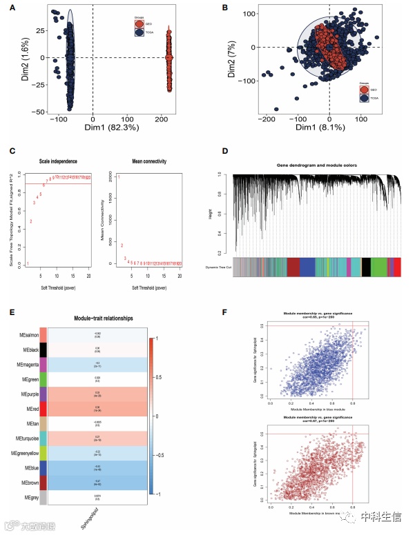 在TCGA数据集中,WGCNA 用于筛选寻找与鞘脂相关的基因组。蓝色和棕色模块与SM关系最密切,共包含 3,787 个基因。