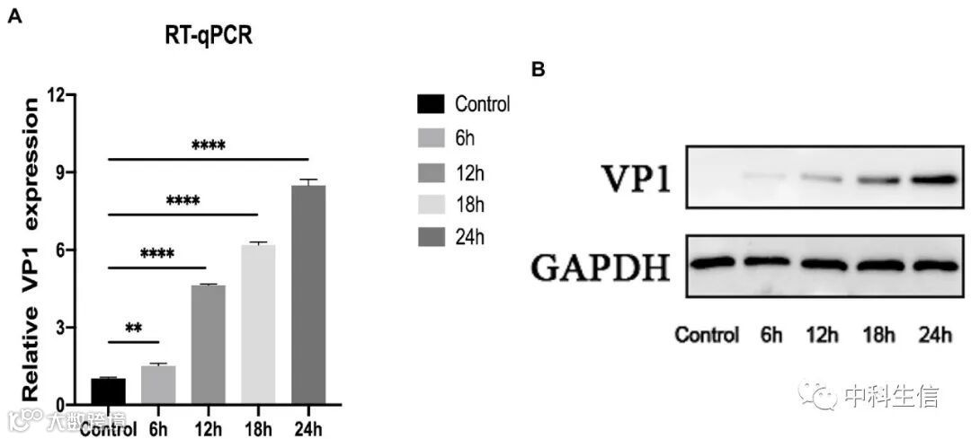 利用qRT-PCR和蛋白印迹法检测RD细胞感染不同时段后的的表达水平,结果表明,VP1的RNA和蛋白表达水平均随着感染时间的增加而显著增加,RD细胞是EV-D68阐明感染过程的一个极好的模型。