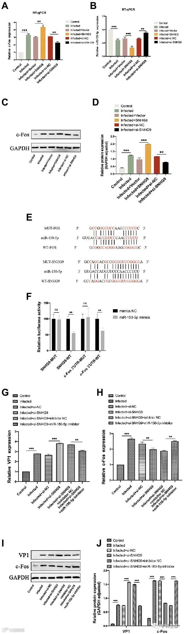 EV-D68感染RD细胞后,过表达SNHG9时miR-150-5p表达降低,而敲除SNHG9时miR-150-5p表达增加。相反,当过表达SNHG9时,RD细胞中c-Fos的表达增加,而当沉默SNHG9时,其表达降低。使用双荧光素酶报告因子,miR-150-5p显著降低了WT-SNHG9/c-Fos组的相对荧光素酶活性。当SNHG9被敲除时,miR-150-5p抑制剂极大地降低了EV-D68感染的RD细胞中病毒复制的刺激,由此得出结论,SNHG9通过miR-150-5p/c-Fos轴调控病毒复制,影响EV-D68感染。