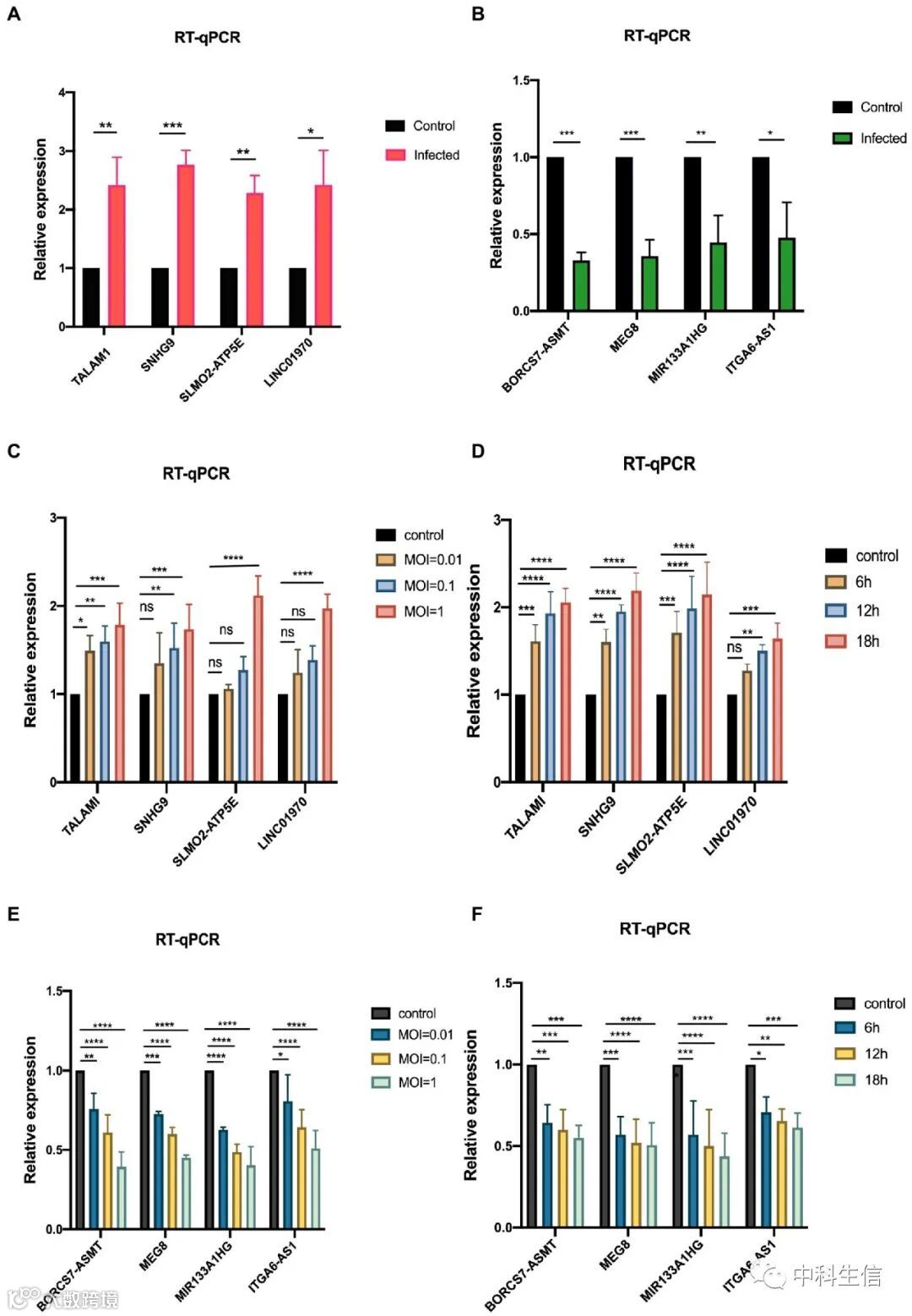 确保分析的可靠性,从375个差异表达lncRNAs随机选择8个lncRNAs进行RT-PCR验证,包括4个上调lncRNAs(TALAM1,SNHG9,SLMO2-ATP5E,LINC01970)和4个下调lncRNAs(BORCS7-ASMT,MEG8,MIR133A1HG,ITGA6-AS1),感染RD细胞24h。发现这些上调基因的表达水平随着时间和浓度的增加而显著上升。随着感染时间的延长和MOI的增加,下调基因的表达水平逐渐下降。这些结果表明高通量测序数据的是可靠的。