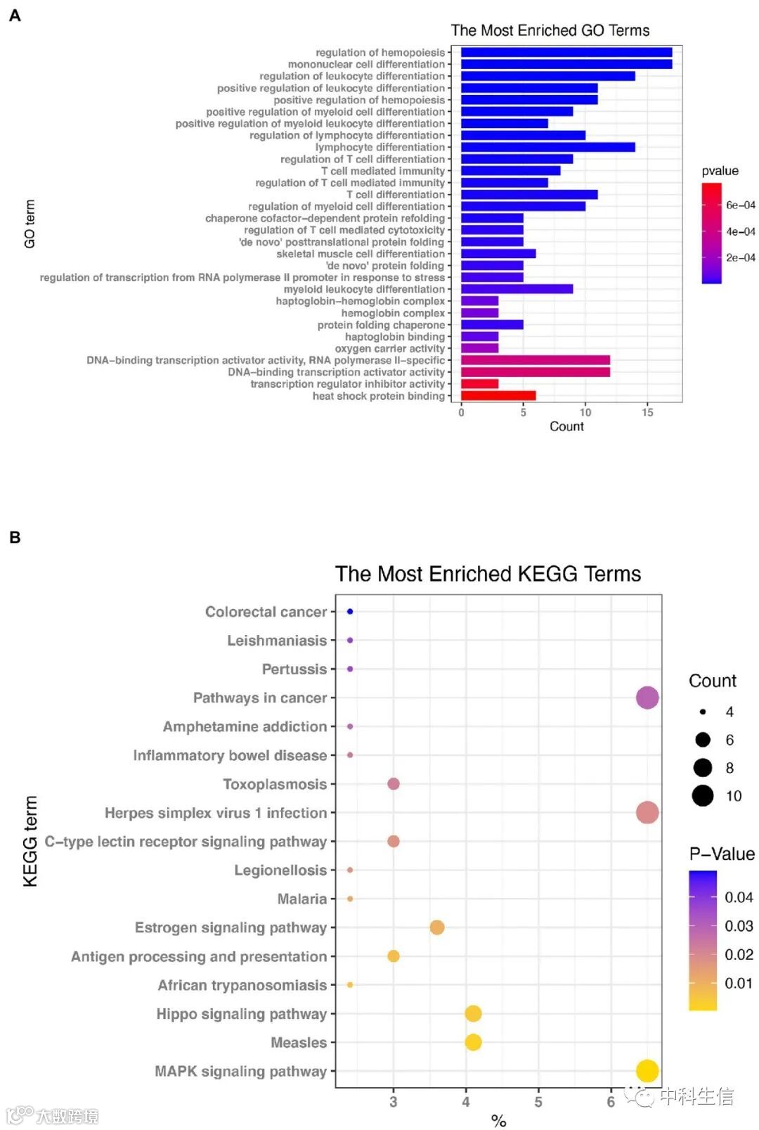 为确定在EV-D68感染模型中差异表达的mRNA中的关键功能和作用途径,对lncRNA调控机制筛选的差异mRNA进行GO和KEGG富集分析。GO富集分析中,BP、CC和MF富集的最重要的途径分别是“造血调节”、“单核细胞分化”、“视紫红质-血红蛋白复合物”、“血红蛋白复合物”和“DNA结合转录激活因子活性、RNA聚合酶II特异性”。KEGG通路富集分析中,信号通路主要在“MAPK信号通路”、“麻疹”、“hippo信号通路”和“单纯疱疹病毒1感染”中富集。