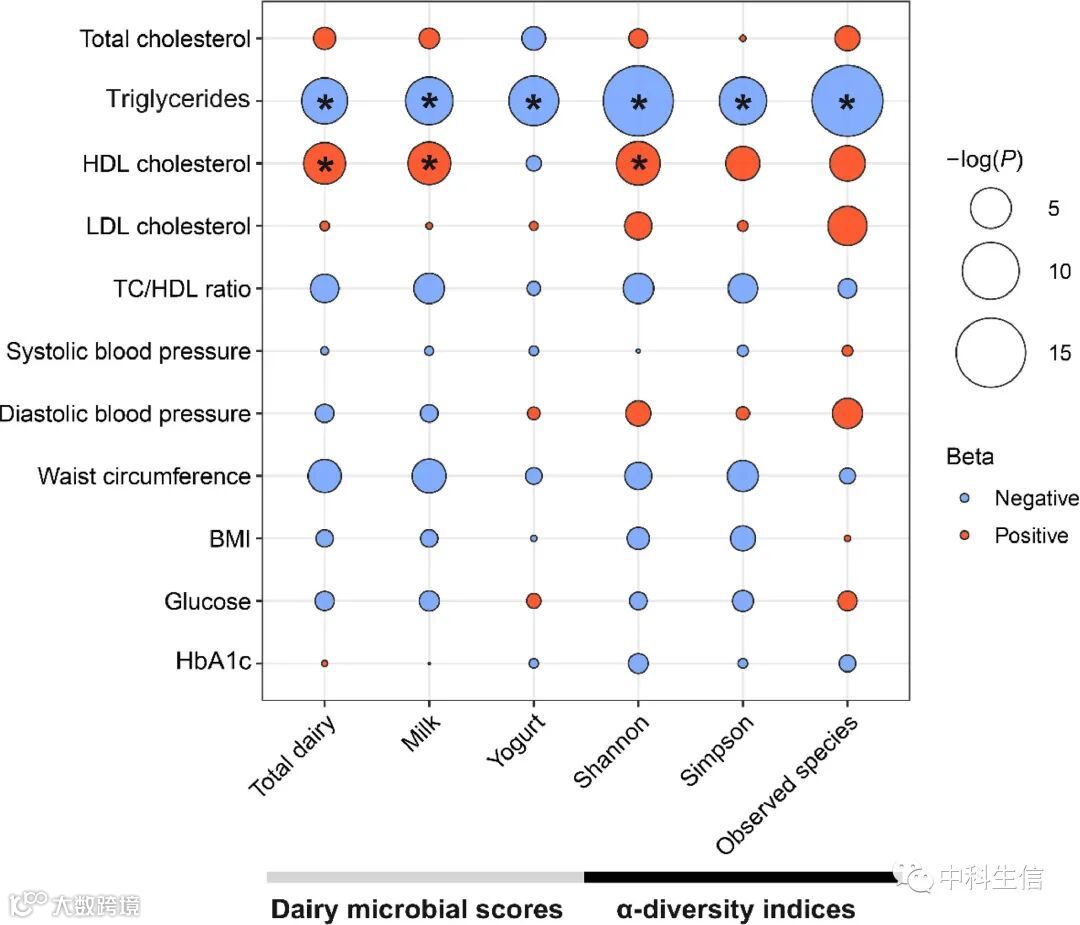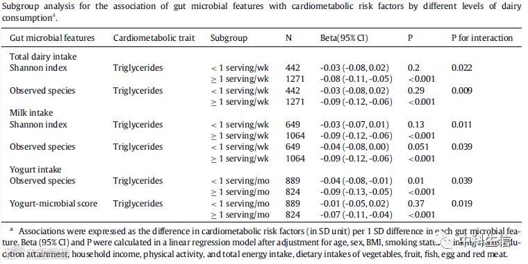 研究观察到总乳制品消耗量与肠道微生物群对血清甘油三酯的显著相互作用。总乳制品摄入量较高的个体中与较低水平的甘油三酯相关同样,分别在牛奶和酸奶消耗量较高的组中,甘油三酯呈降低趋势。